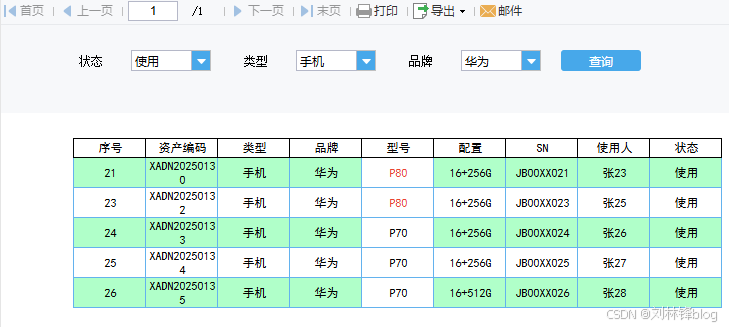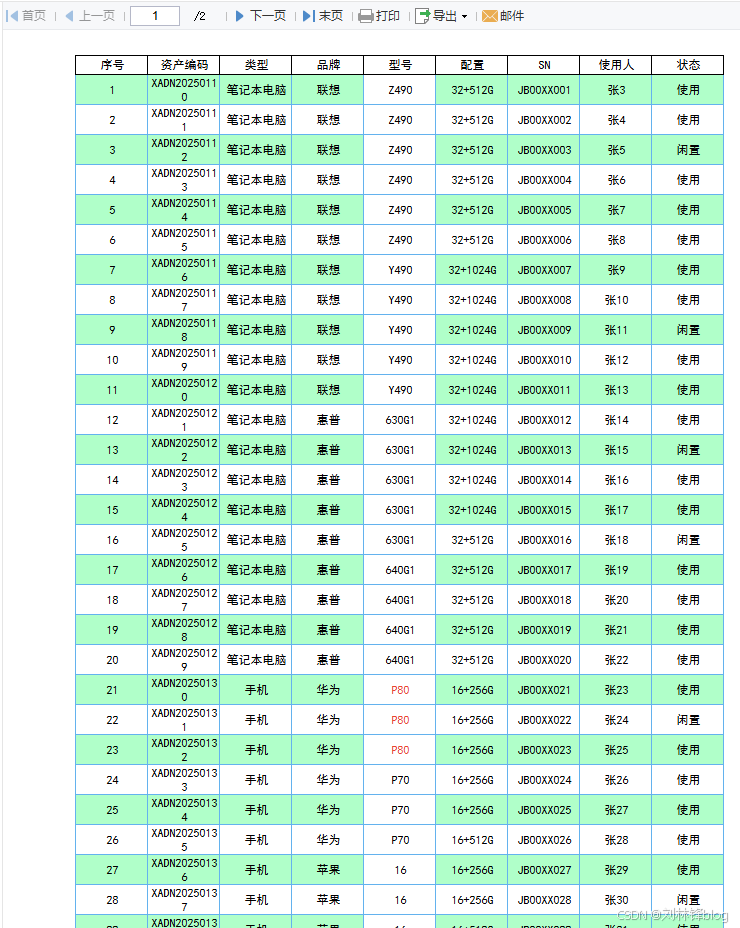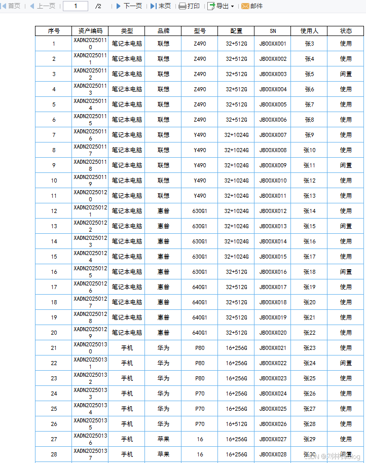 ('XADN20250131', '手机', '华为', 'P80', '16+256G', 'JB00XX022', '张24', '闲置'),