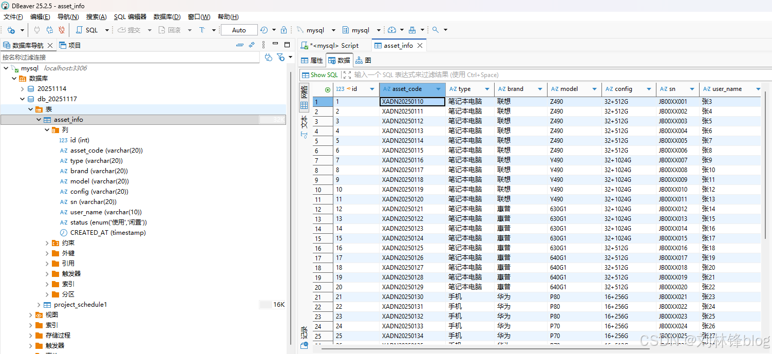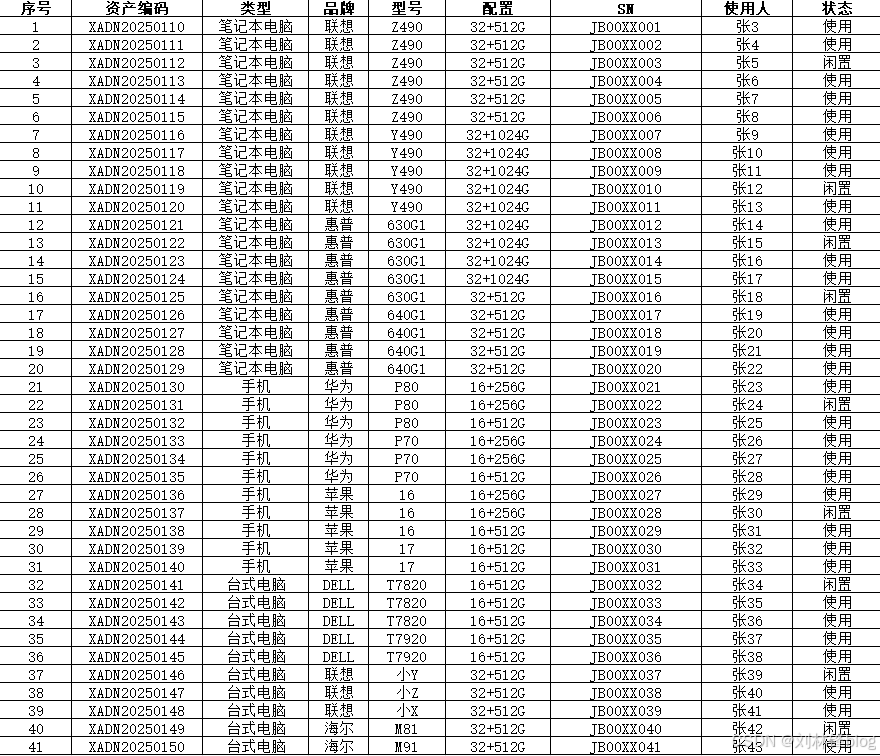 ('XADN20250114', '笔记本电脑', '联想', 'Z490', '32+512G', 'JB00XX005', '张7', '使用'),