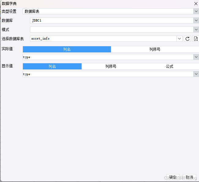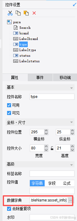 5)点击右侧的「控件设置」,选中「状态/品牌/类型」,选择「属性」,设置数据字典为[数据库表」。如下图所示: