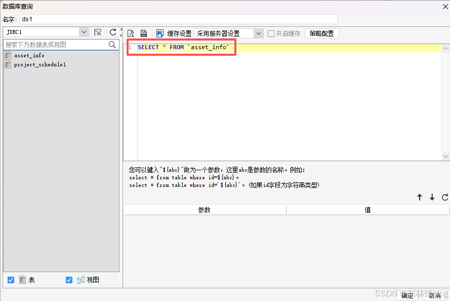 新建数据集 ds1,数据库查询对话框中写入 SQL 查询语句,取出「asset_info」表中所有数据,如下图所示: