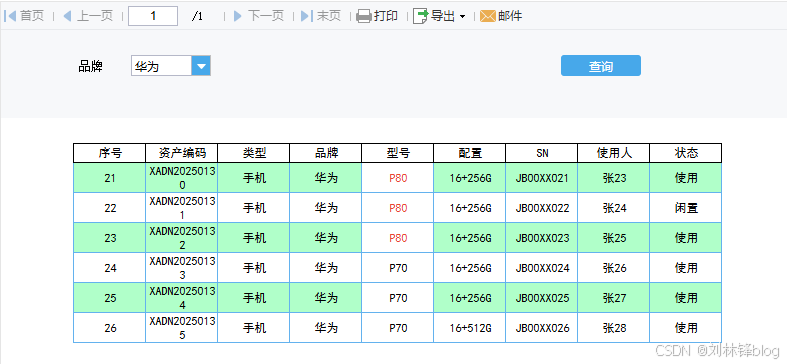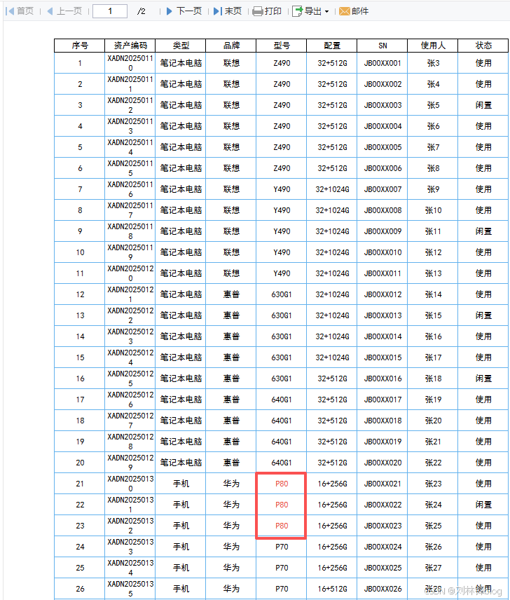 ('XADN20250130', '手机', '华为', 'P80', '16+256G', 'JB00XX021', '张23', '使用'),