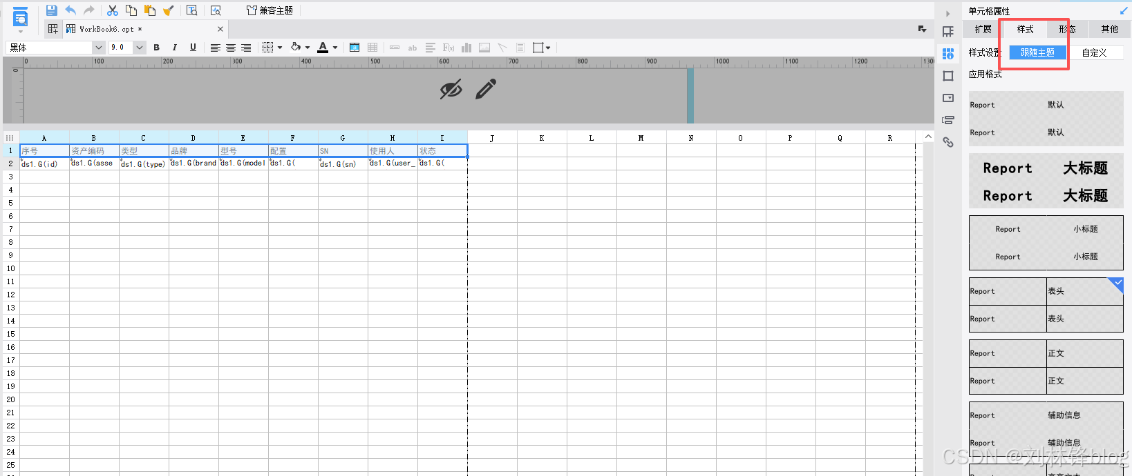 1)A1~I1 单元格写入表格标题信息,选中 A1~I1 单元格,右边属性面板选择「单元格属性>样式」,样式设置选择「跟随主题」。