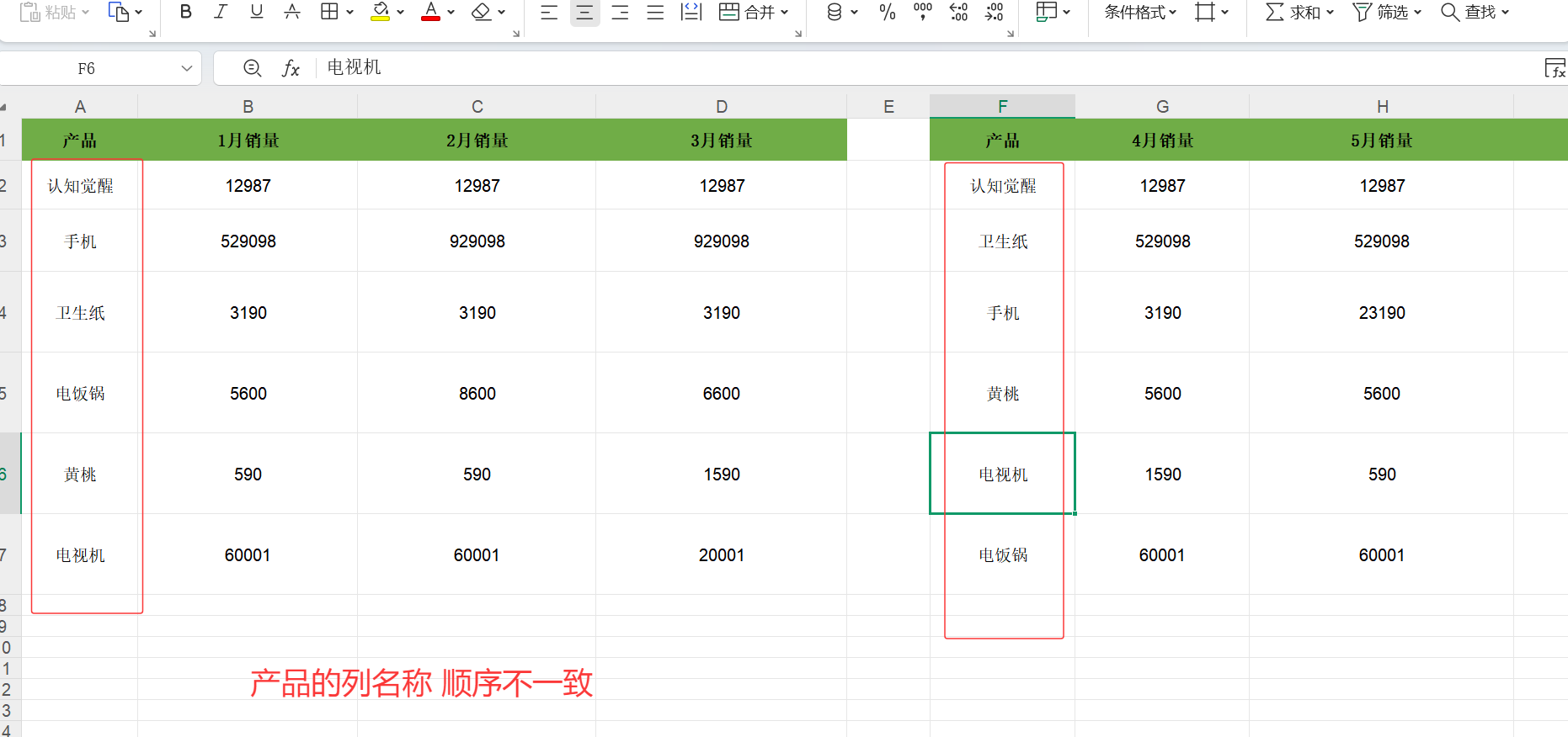 乱序列对比: 比如我有一个excel , 需要对比左表的 1月份销量(B列) 和右表的4月份销量(G列),匹配的列是产品列,由于现在产品名称的顺序是不一致的,也就是乱序列对比。如下图: