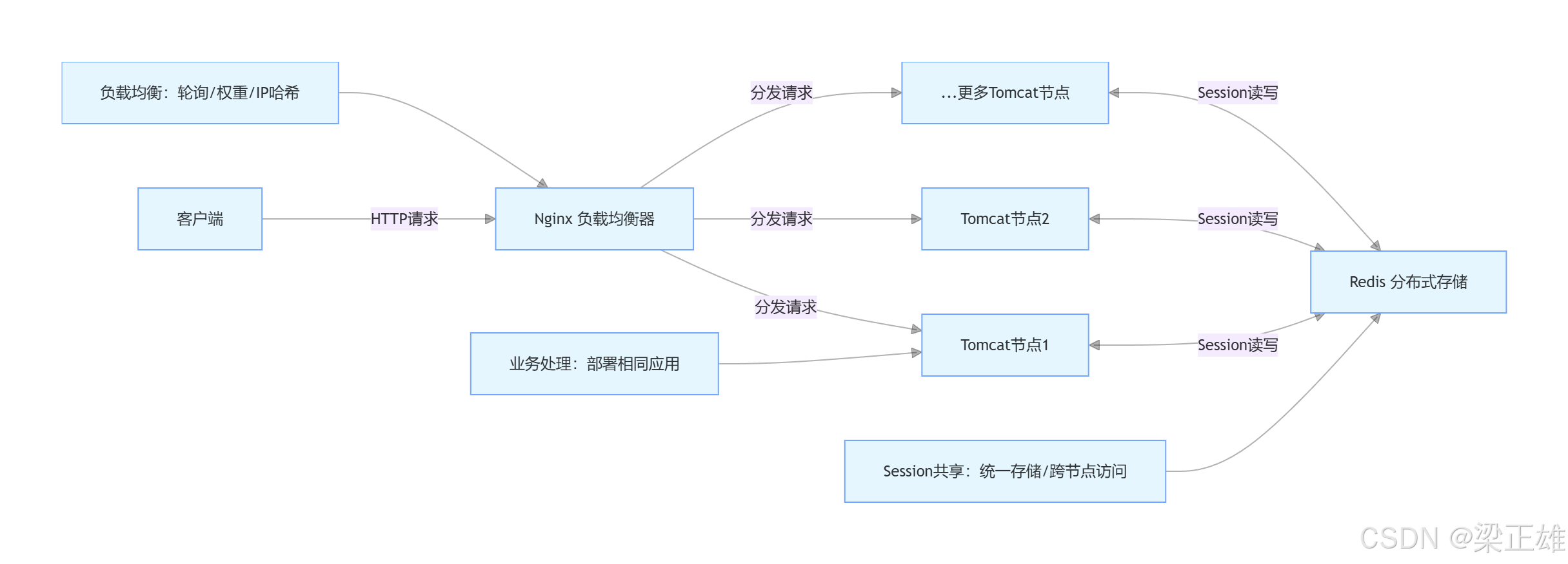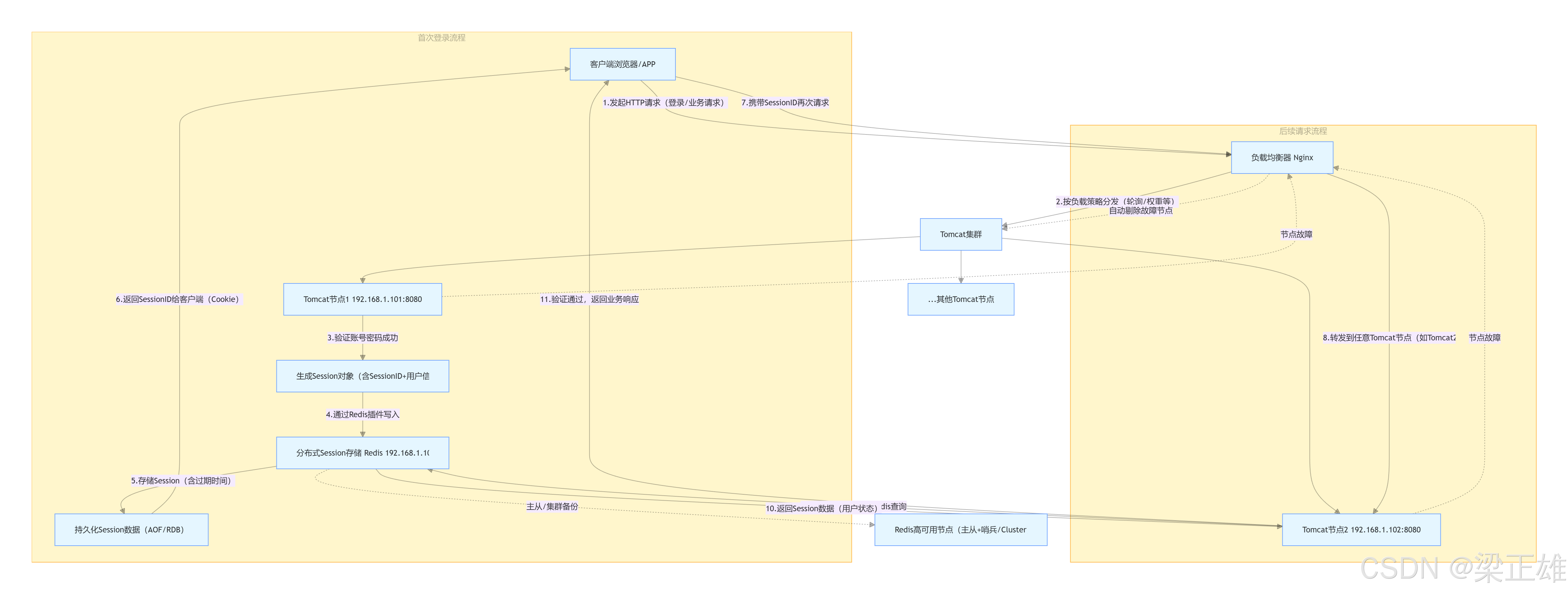 Tomcat-Redis-Session-Manager插件将 Session 数据(SessionID、用户信息、过期时间等)写入 Redis。 - 后续请求:Nginx 将请求转发到任意 Tomcat 节点(如 Tomcat2),Tomcat2 通过 SessionID 从 Redis 读取 Session 数据,验证用户状态,实现 "一次登录,多节点共享"。