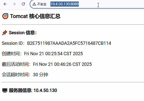 bashmkdir /data/tomcat18080/webapps/ROOT/ vim /data/tomcat18080/webapps/ROOT/index.jsp <%@ page language="java" contentType="text/html; charset=UTF-8" pageEncoding="UTF-8"%> <%@ page import="java.net.InetAddress" %> <%@ page import="java.net.NetworkInterface" %> <%@ page import="java.util.Enumeration" %> <%@ page import="java.io.File" %> <html> <head> <title>Tomcat 核心信息查询(含运行路径)</title> </head> <body> <h3>🎯 Tomcat 核心信息汇总</h3> <hr> <p><strong>📌 Session 信息:</strong></p> <p>Session ID:<%= session.getId() %></p> <p>创建时间:<%= new java.util.Date(session.getCreationTime()) %></p> <p>最后活动时间:<%= new java.util.Date(session.getLastAccessedTime()) %></p> <p>会话超时时间:<%= session.getMaxInactiveInterval() / 60 %> 分钟</p> <hr> <p><strong>🖥️ 服务器信息:改成服务器ip </strong></p> </body> </html>- 三台都要加上,然后访问 ip:18080