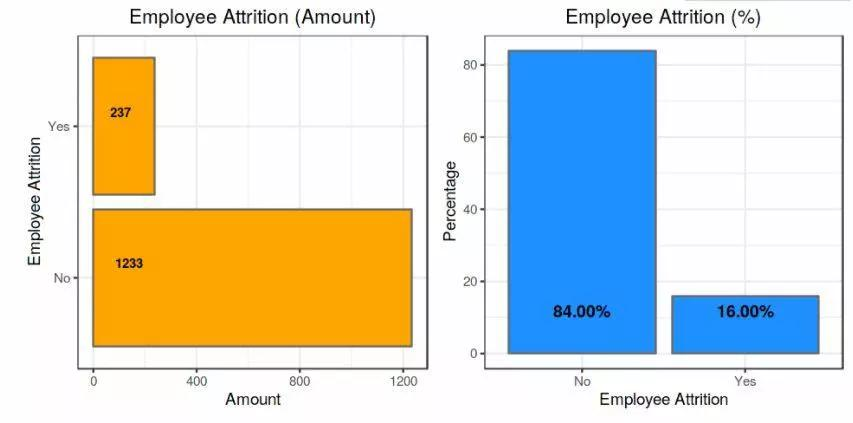 左侧图表显示离职人数中,男性和女性的数量分布;右侧图表则展示了不同性别的离职比例。从数据可以看出,整体离职比例为 16.00%,但具体到不同性别的差异还需进一步分析。