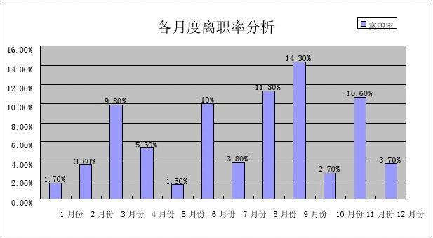 从图中可以看出,9 月份离职率最高,达到 14.30%,4 月份最低,为 1.50%。这种季节性波动可能与企业业务周期、年终考核等因素有关。