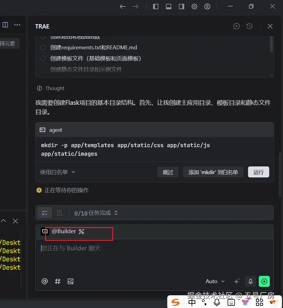 打开Trae IDE,在Trae对话窗口选择 @Builder智能体,输入对话"创建一个Flask项目模板",这时内置智能体就开始为我们初始整个项目,点击"运行",之后就可以创建一个初始化的项目。