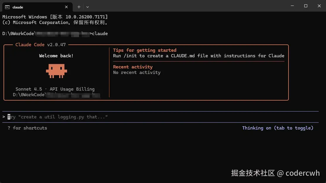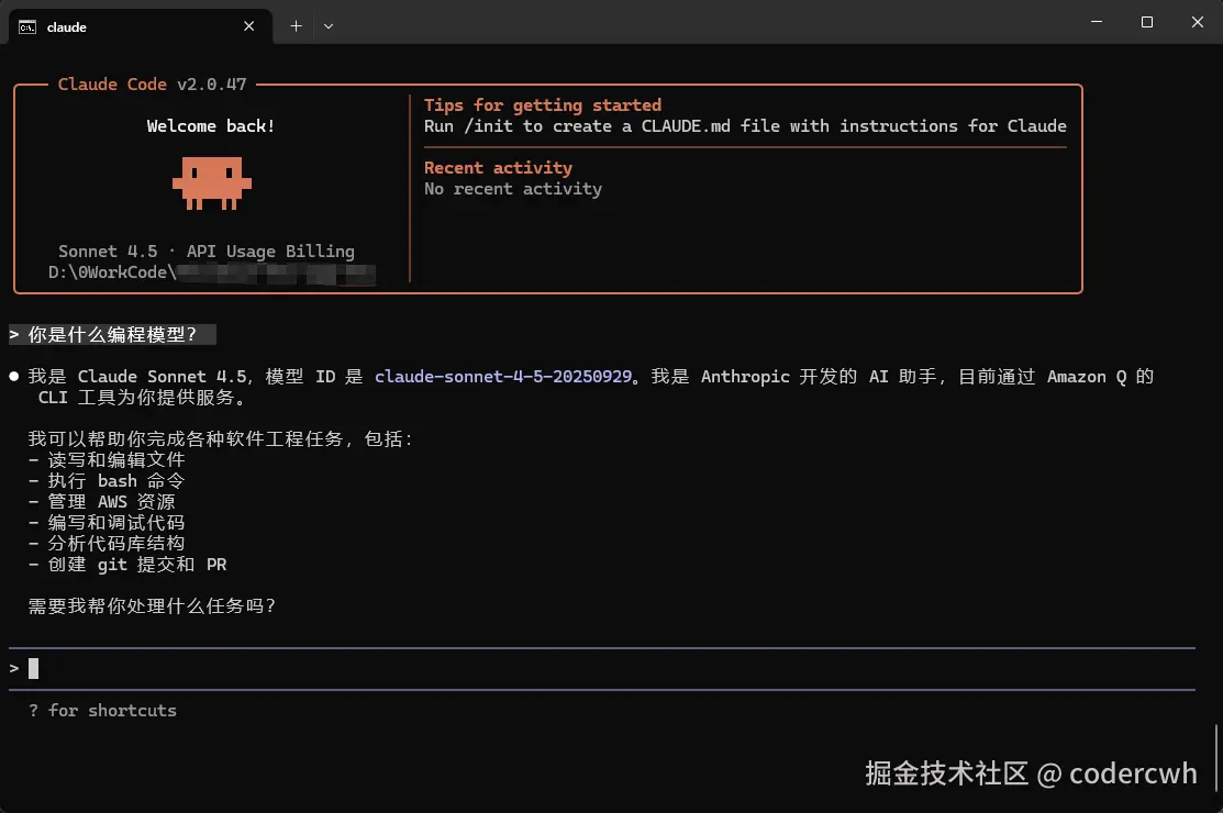 配置完毕后重新打开终端输入claude,测试下: