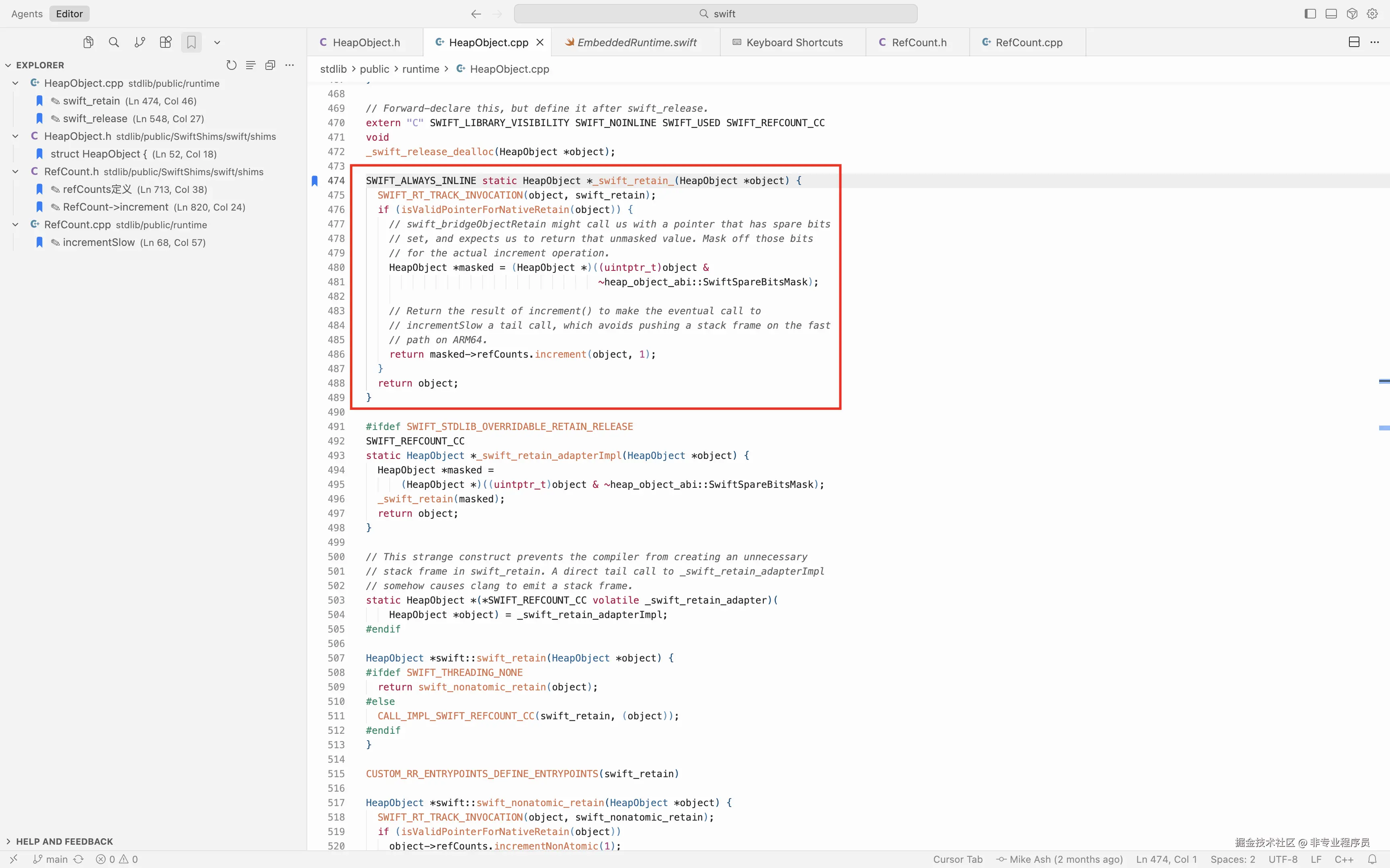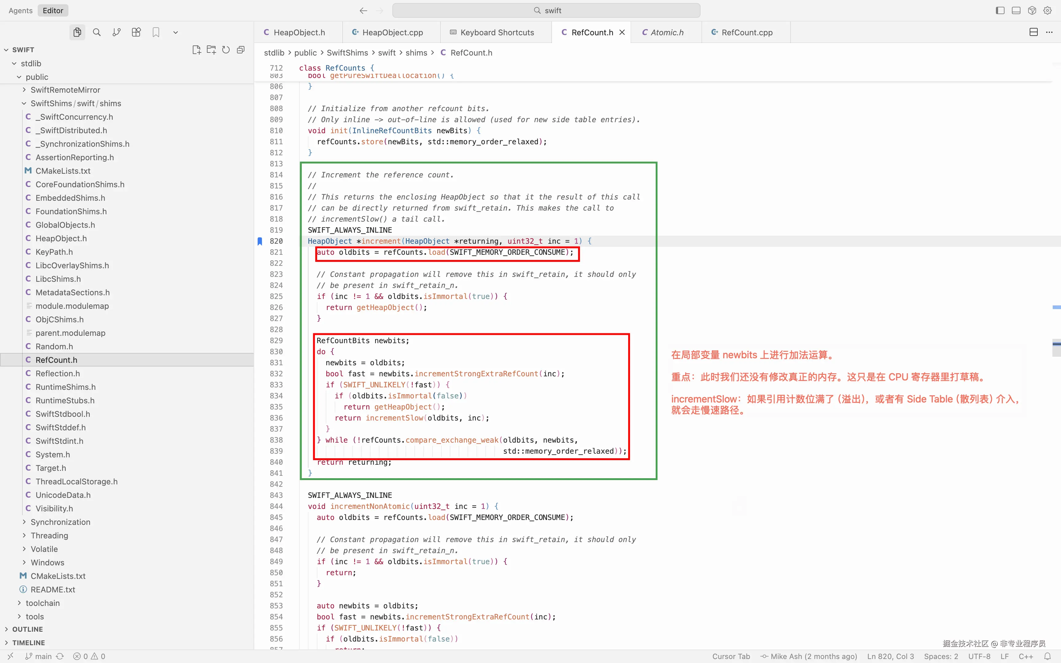 可以看出 swift_retain 中对引用计数的读写操作都是原子的。