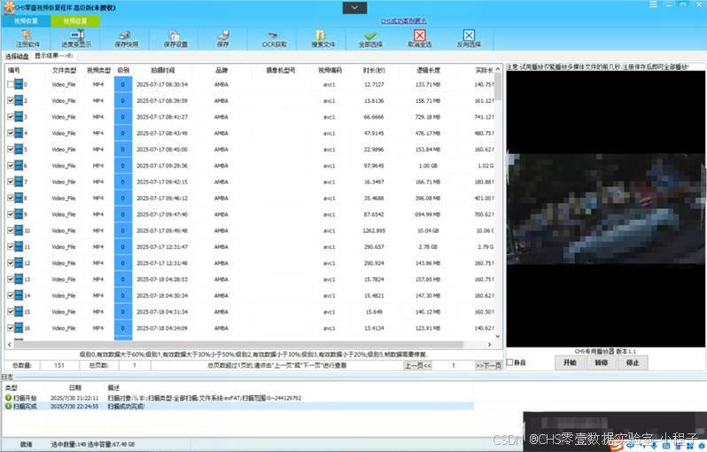 STEP3:扫描完成后直接查看数据,可以看到程序已经列出了视频类型、级别、拍摄时间、摄像机型号、视频编码、时长、长度、等参数,这些参数为查找数据提供了便利。经过核对成功找回了所有剩余空间中的视频文件,至此恢复工作完成。