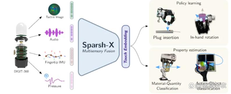 单纯依靠视觉模态已不足以满足复杂任务需求。前沿研究正积极将视觉触觉与音频(声学振动)、惯性(运动)、温度等感知模态融合。HapticVLM系统就结合了视觉语言模型来推断环境温度,以提供更丰富的触觉反馈。Sparsh-X框架则系统性地证明了融合视觉、音频、IMU和压力四种模态能极大提升机器人的操作性能。