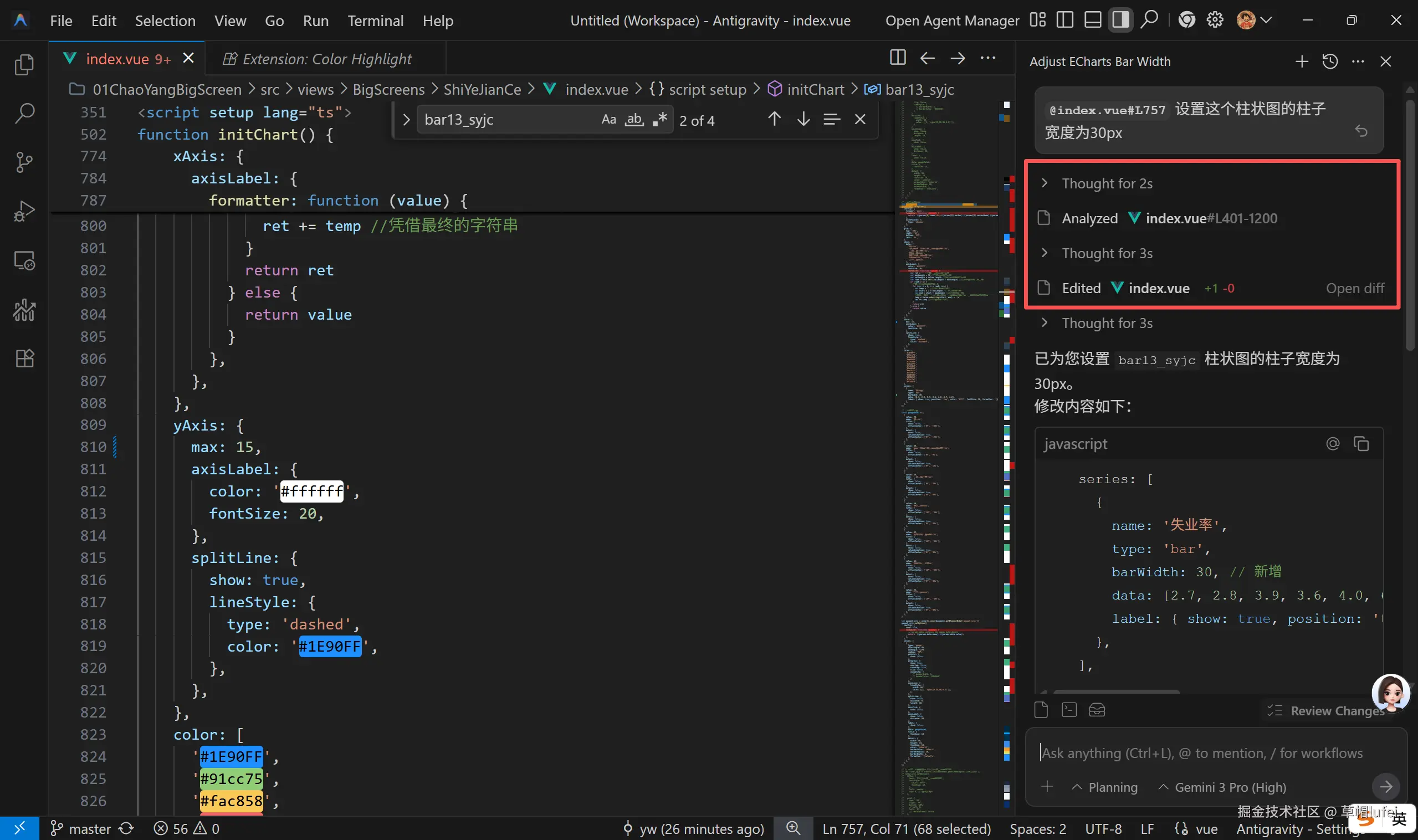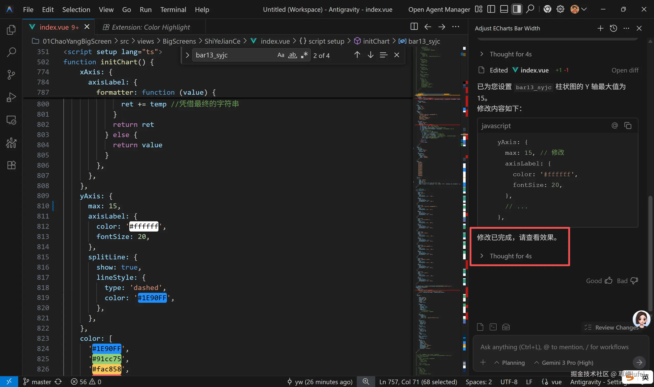 测试编码理解能力和速度,模型使用默认的 Gemini3 Pro(High), 测试的两个小改动,两三秒就改完了,改完提供的结果,我用的 Planning 模式,点击一下 accept 就行了,剩下的它还会继续分析,提供关键代码展示,但是完全不需要,因为我已经通过热更新的方式在页面验证过效果了