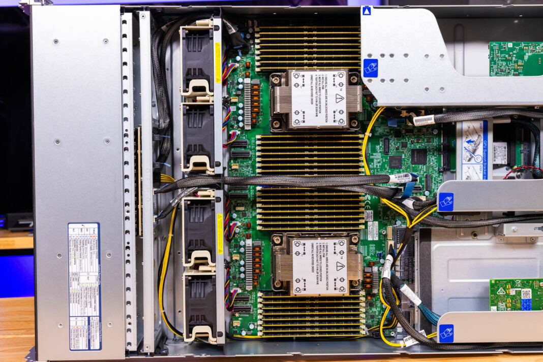 而在12通道平台(例如这款技嘉的AMD EPYC服务器)上实现每个通道两个DIMM,会导致服务器主板布局看起来不自然。安装48个(或32个)DIMM会带来内存带宽的损失,因为内存通道会降低时钟频率以处理更长的布线长度。2DPC的48 DIMM平台运行DDR5的速度较慢,即使只使用了48个DIMM插槽中的24个。