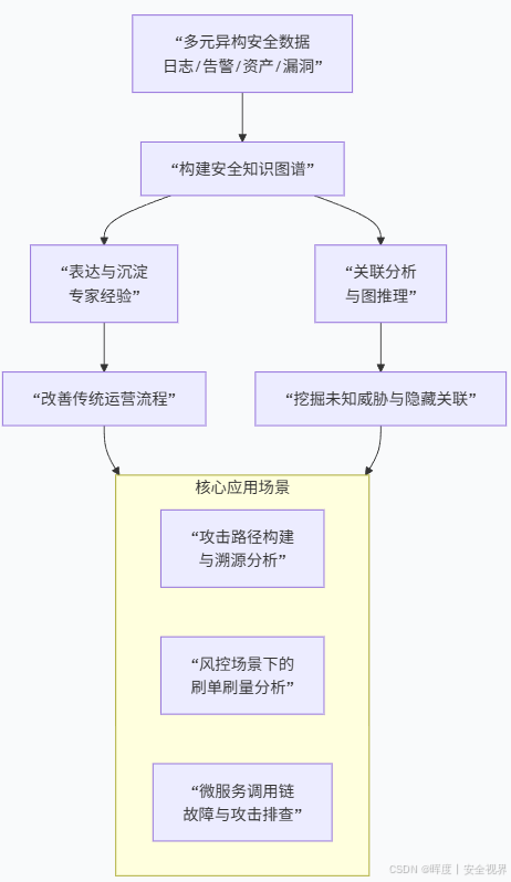 安全知识图谱的核心价值是将碎片化的数据转化为全局性的洞察,其应用场景与工作逻辑如下图: