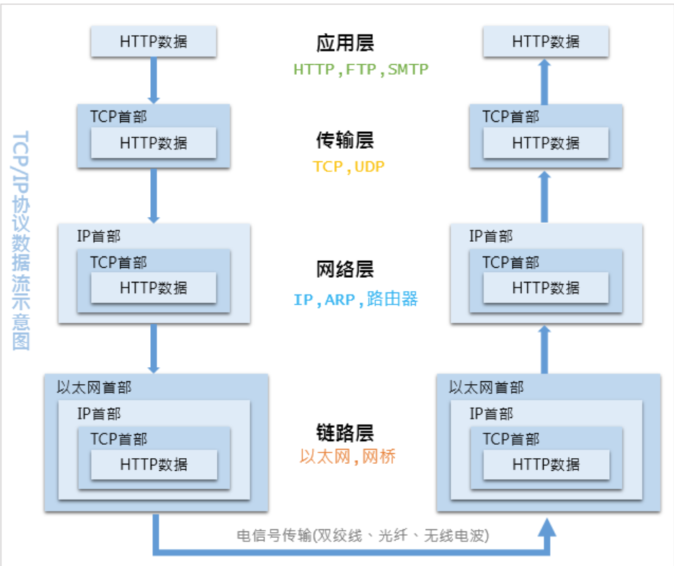 在传入数据时候,每经过一层,其都会对其进行一次包装 ,相反在传出数据时候,每经过一层,其都会对其进行一次拆包装