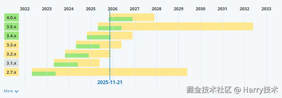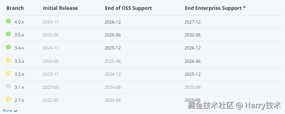 - 3.x 版本关键提示:3.5.x 是 3.x 系列的最后一个重大版本,开源支持将持续至 2026 年 6 月,商业支持延长至 2032 年 6 月。官方建议当前使用 3.x 的项目,先升级至 3.5.x 版本 ------ 该版本已内置 4.0 迁移所需的关键特性与适配机制,可实现 "平滑过渡"。