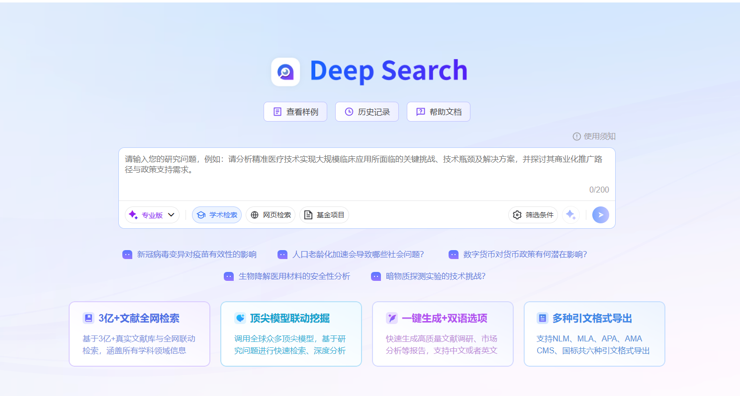 - 语义检索:输入一句完整的问题或研究方向,系统会分析语义,从数据库和互联网资源中检索相关文献。相比单纯的关键词,这种方式能减少无关结果。
