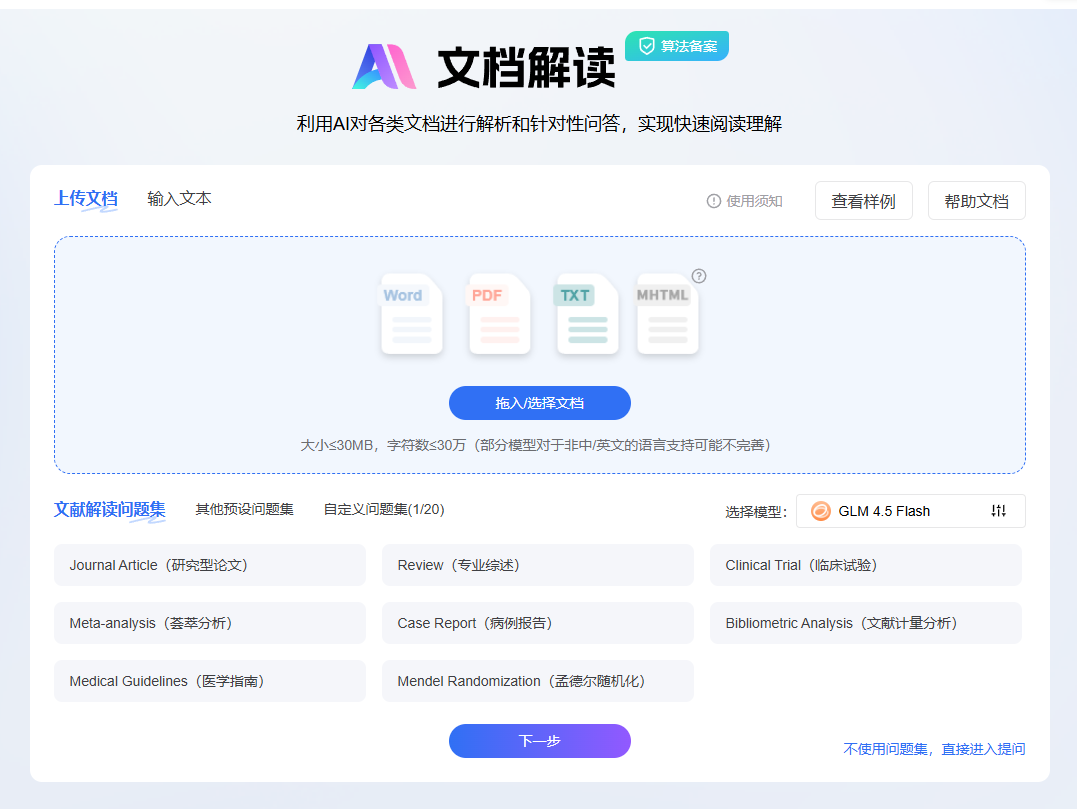 文档解读解决的是"读"的问题。即使文献检索做得很精确,读懂每篇论文仍然需要时间,尤其是英文文献或结构复杂的文章。