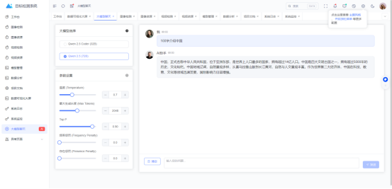 大模型聊天界面如下图所示,用户可选择大模型、更改模型配置等,提问问题后,系统流式输出大模型的输出