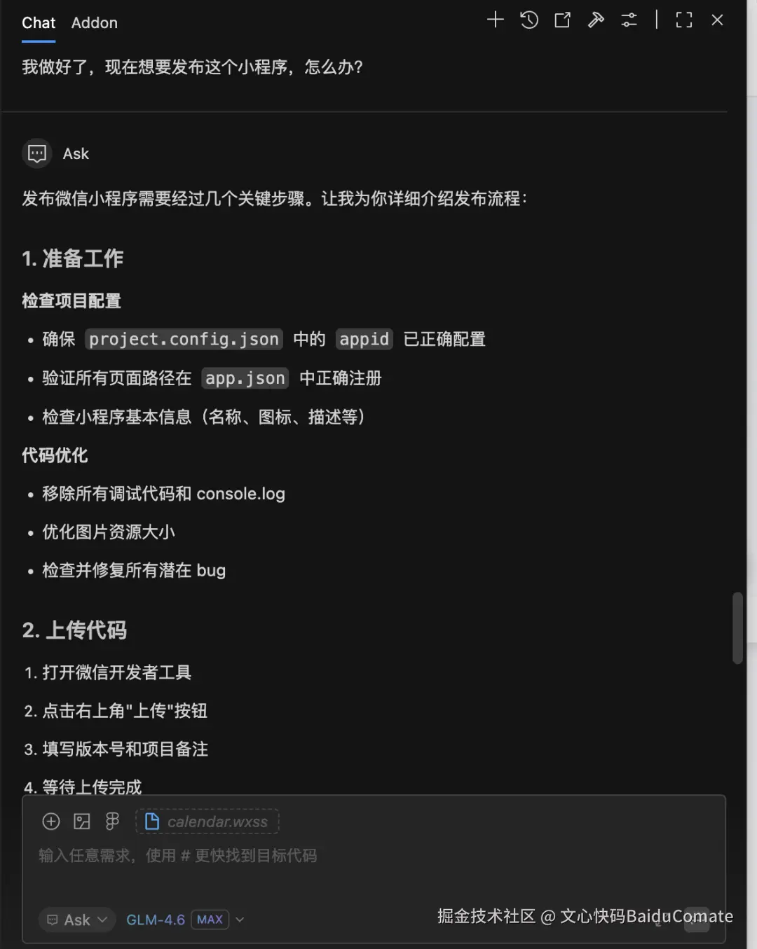 Ask智能体为我生成了一份详尽的小程序发布指南,从发布前准备、代码上传、提交审核、注意事项到最终发布上线,每个步骤都讲解得清清楚楚。