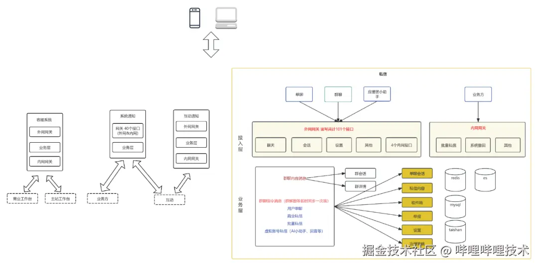 按业务全域现状,在服务端角度分成客服系统、系统通知、互动通知和私信4个业务线,每个业务线内按现状标识了服务分层。私信内分为用户单聊、bToC的批量私信、群聊和应援团小助手四类,这四类细分私信没有技术解耦,单聊和批量私信比较接近系统天花板。