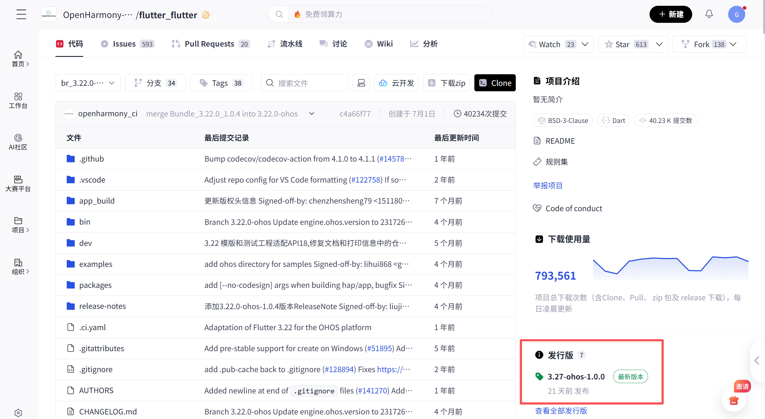 我们需要访问一下仓库,看一下最新的发行版版本:https://gitcode.com/openharmony-tpc/flutter_flutter