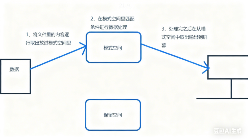 读取 :从输入流(文件、管道或标准输入)中读取一行内容,存入临时的缓冲区中,又称之模式空间(pattern space)。