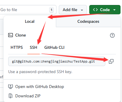 打开 GitHub 目标仓库页面,点击「Code」按钮,切换到「SSH」标签,复制 SSH 地址(格式:
