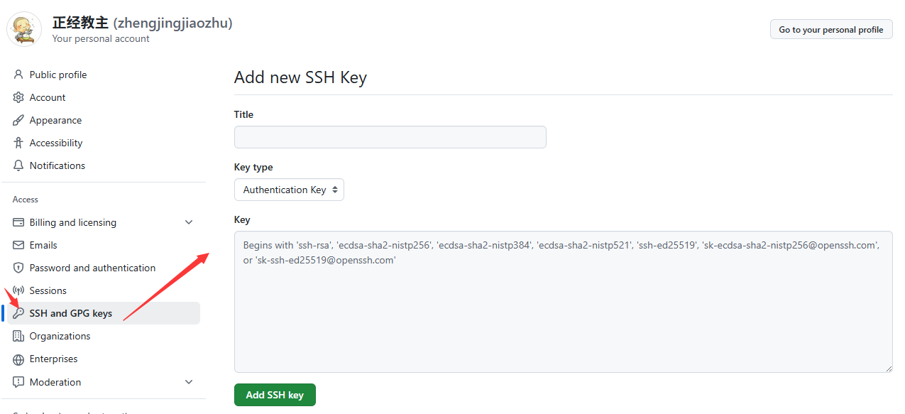 - 左侧菜单栏找到「SSH and GPG keys」(SSH 和 GPG 密钥)→ 点击进入;