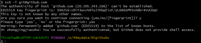 - Hi 你的GitHub用户名! You've successfully authenticated, but GitHub does not provide shell access.