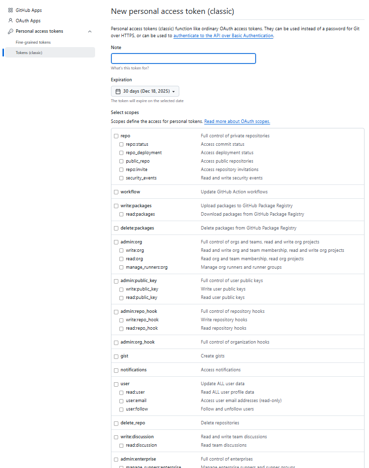 配置项 作用与建议 Note 填写令牌用途说明(如 "Git HTTPS 推送认证"),方便后续区分不同令牌的用途。 Expiration 选择令牌有效期(默认 30 天),建议根据场景选择(短期任务选短时效,长期服务选长时效),过期需重新生成。 Select scopes(权限范围) 需勾选对应权限以赋予令牌能力,常见场景配置如下:- Git 推送 / 拉取 :勾选 repo(私有仓库完全控制)或public_repo(公共仓库控制);- GitHub Actions 工作流 :勾选workflow;- 包管理(如 GitHub Packages) :勾选write:packages、read:packages等;- 用户信息操作 :勾选user下的read:user等。建议遵循 "最小权限原则",仅勾选必要权限。 -