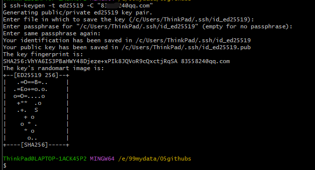~/.ssh/id_rsa,无需修改); - 「Enter passphrase」:密钥密码(可选,设置后每次使用需输密码,更安全;初学者可直接回车跳过,免输密码);