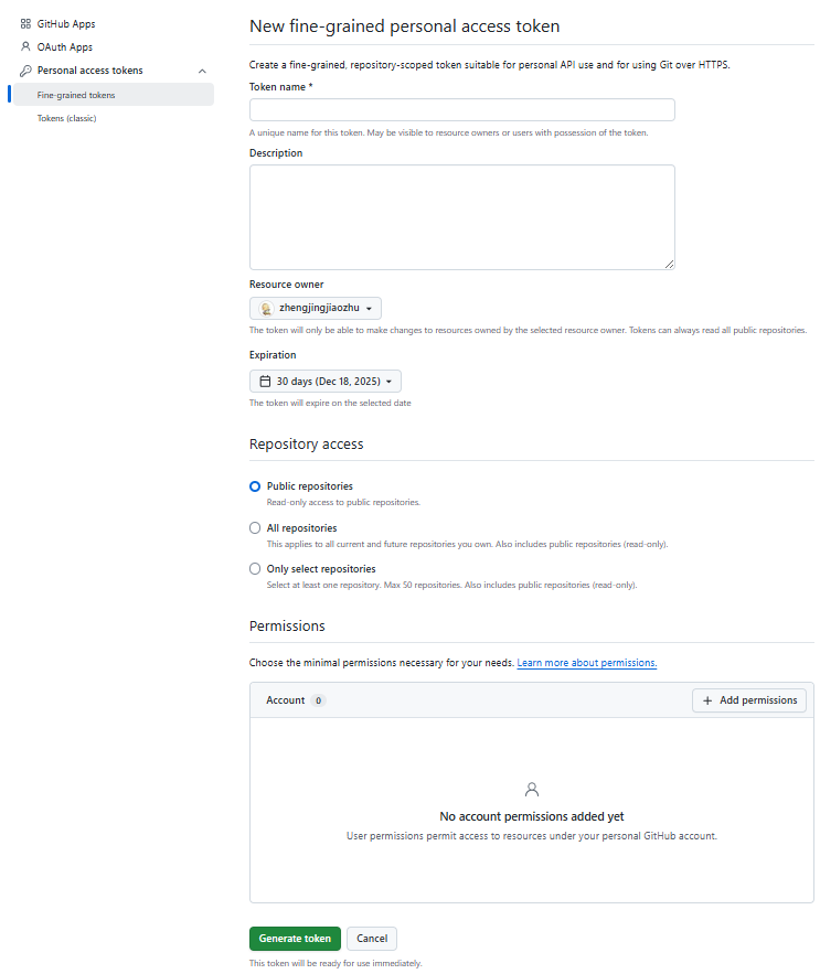 配置项 作用与建议 Token name 填写令牌名称(如 "前端项目 API 访问令牌"),用于区分不同用途的令牌,建议语义化命名。 Description 选填项,可描述令牌用途(如 "用于本地 Git 推送 HTTPS 认证"),方便后续管理。 Resource owner 默认关联你的 GitHub 账号(如 zhengjingjiaozhu),确保令牌仅操作你名下的资源。Expiration 选择令牌有效期(默认 30 天),建议根据使用场景选择(短期任务选短时效,长期服务选长时效),过期后需重新生成。 Repository access 选择仓库访问范围:- Public repositories :仅只读访问公共仓库;- All repositories :访问你所有仓库(含公共和私有);- Only select repositories:仅访问指定仓库(最多 50 个)。建议遵循 "最小权限原则",按需选择范围。 Permissions 点击「+ Add permissions」可添加细分权限(如仓库的 "Read and write"、Issues 的 "Read-only" 等),需根据实际需求配置(如 Git 推送需仓库的写权限)。 -