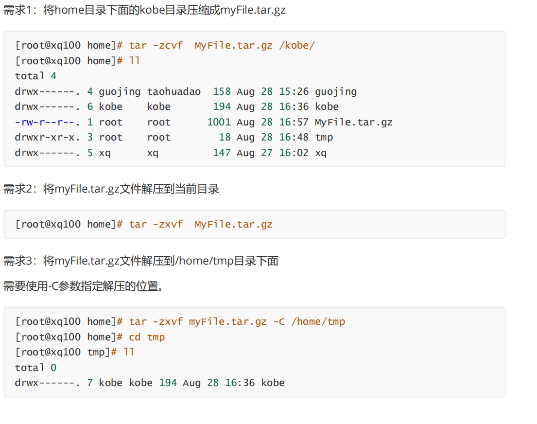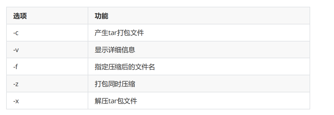语法格式:tar [选项] XXX.tar.gz 打包的内容 (功能描述:打包目录,压缩后的文件格式.tar,gz)