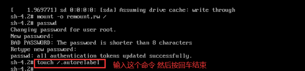 接着在光标闪烁的位置输入: touch /.autorelabel(注意touch 与后面的/之间有空格)。完成后按