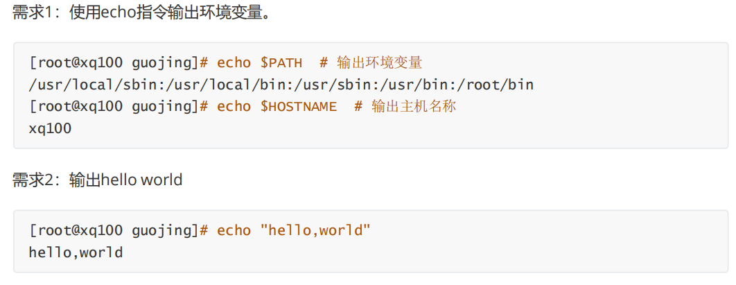 echo 'hello' > /home/guojing/test.txt (将hello输入到guojing文件夹下的test.txt中 之前内容覆
