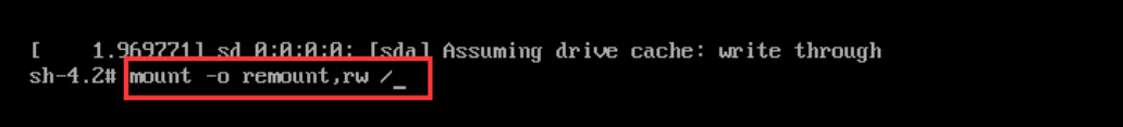 接着在光标闪烁的位置输入: mount -o remount,rw / 然后按回车键。