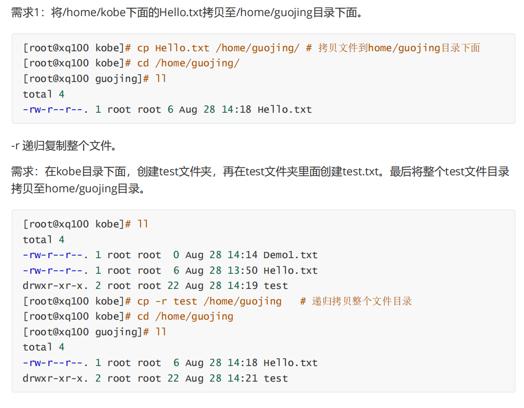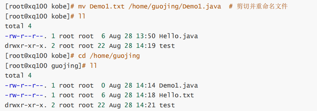 将home/kobe目录下面的Demo1.txt文件剪切到/home/guojing目录下面,并将文件命名为