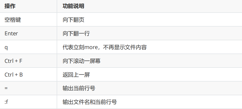 more指令是一个基于vi编辑器的文本过滤器,他以全屏的方式显示文本文件的内容,more 指令内置了若干快捷键。