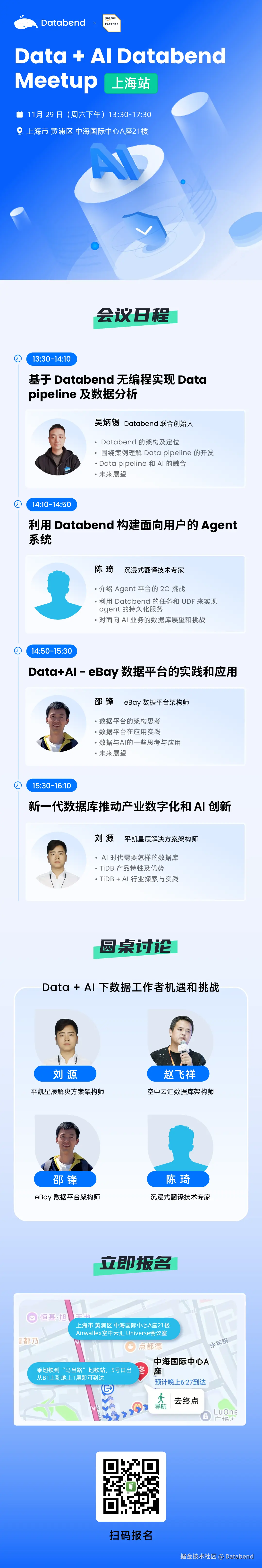 数据洪流奔涌,AI 浪潮澎湃。当 Data 与 AI 深度交织,如何构建面向未来的技术栈?如何在这场变革中抢占先机?11月29日「DATA AI Databend Meetup」 应势而来!我们力邀多位来自明星开源项目与一线大厂的资深专家,为您全景解析数据平台架构、AI 创新实践与职业发展路径,开启一场思想与技术的碰撞。