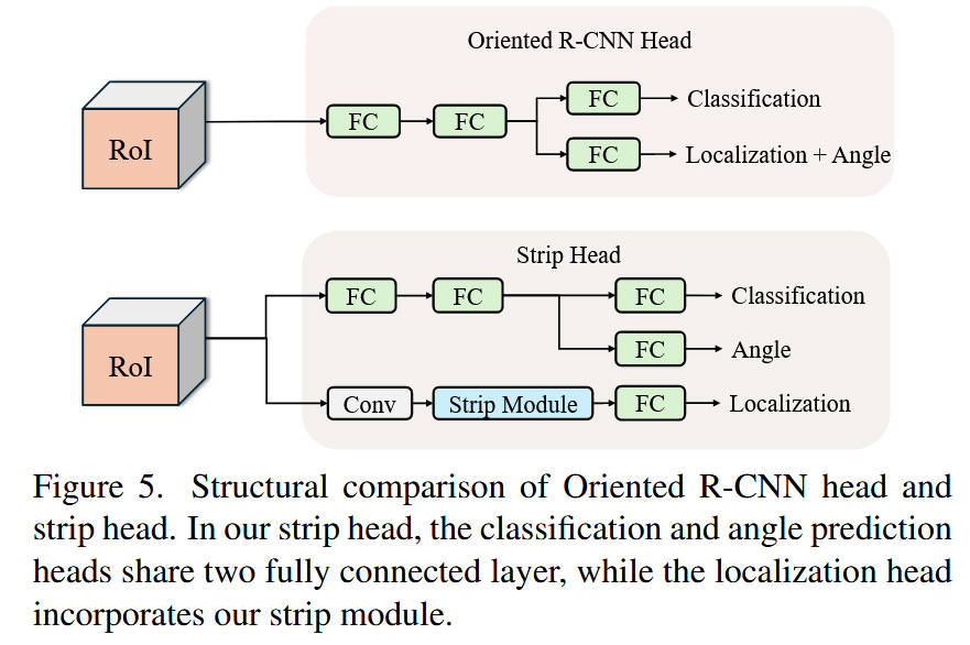 - 检测头 (Strip Head) :基于 Oriented R-CNN 的框架,但对 Head 进行了改造。RoI 特征被送入解耦的三个分支:分类分支、角度分支和定位分支。其中定位分支嵌入了 Strip Module。