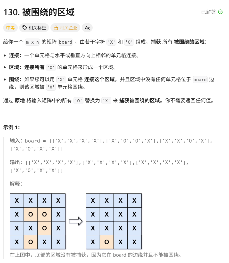 在这道题中,我们面临着一场"围棋"般的局势。棋盘上布满了 X 和 O。规则是:任何被 X 完全包围 (无法到达边界)的 O,都会被"吃掉"(变成 X)。而那些连接着边界 的 O,则能"逃过一劫"。