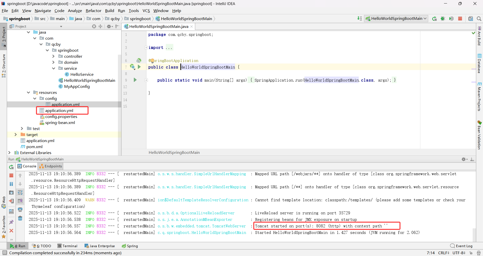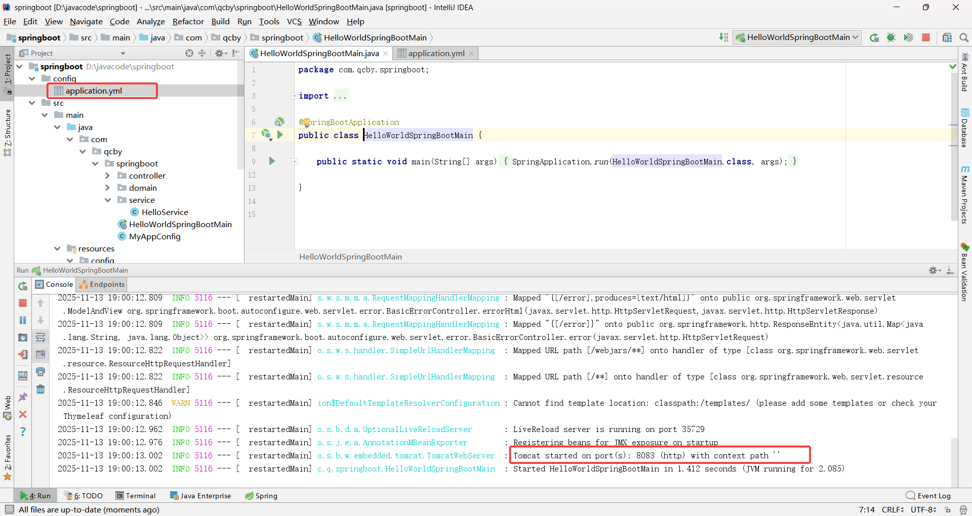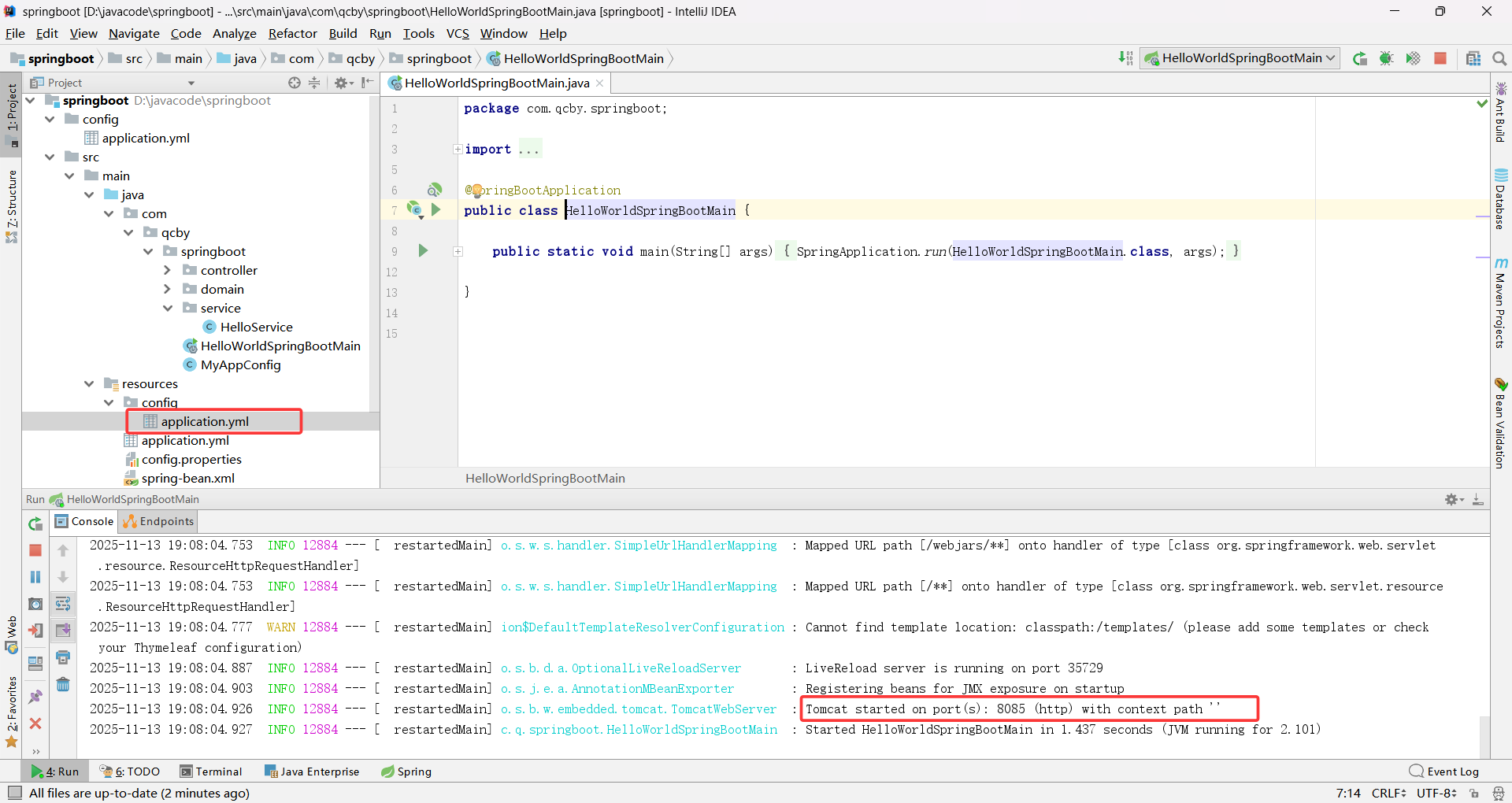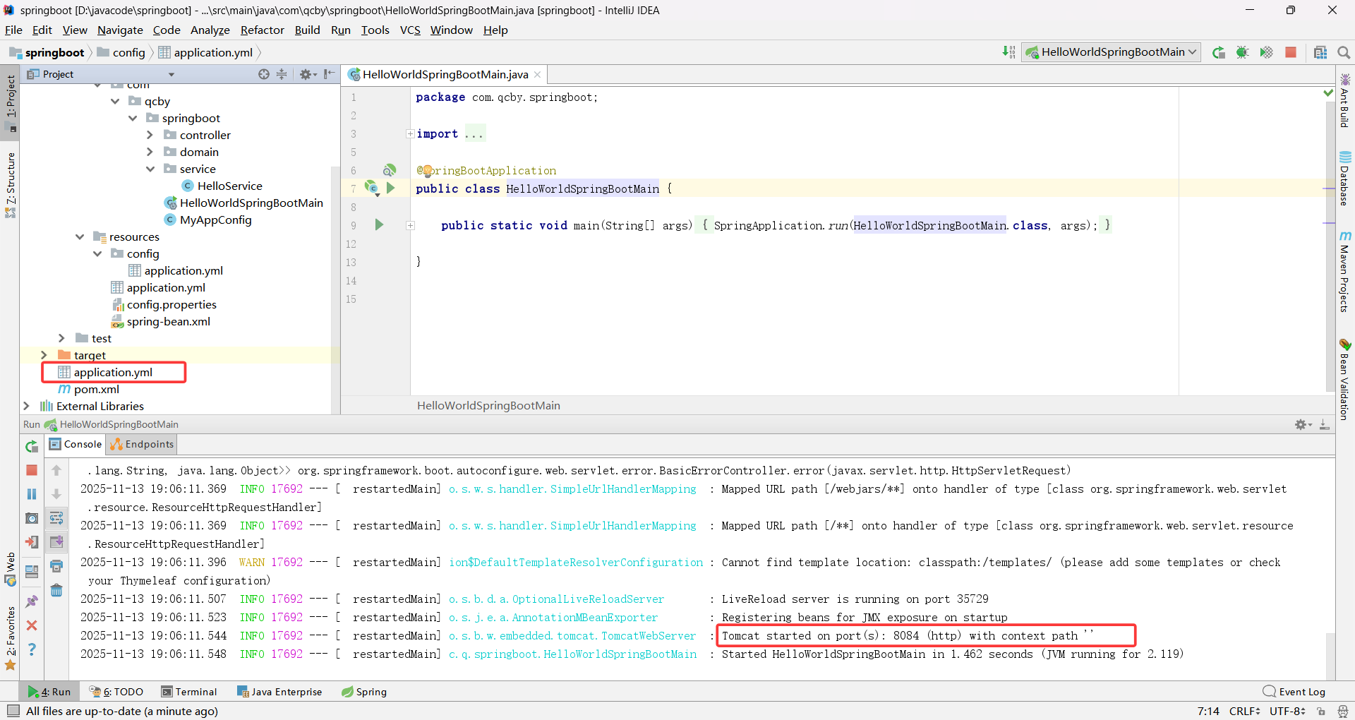 Springboot 启动会扫描以下位置的 application.properties / application.yml 文件作为 Spring boot 的默认配置文件 ,配置文件在项目 src/main/resources 下,打包后会嵌入 Jar 包中
