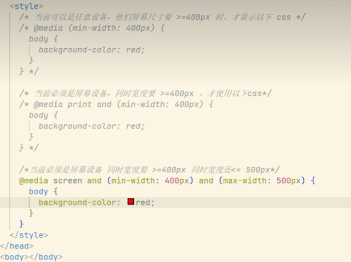 - or :用于连接多个条件,满足其中一个即可(在CSS媒体查询中使用逗号