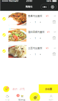 3.购物车界面:用户在进行点餐时,可以先将想要的菜品加入购物车,选择完毕后直接进入购物车中确定最终要点的菜品并选取结算,即可完成点餐。同时也能根据自己需求的变化对购物车中的菜品进行增删操作。