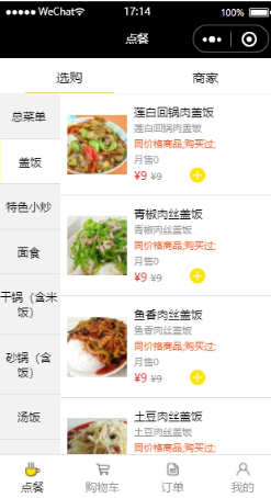 1.菜品列表:用户进入小程序主界面选择商家就能够进入店铺,浏览所有菜品信息,并在线选餐下单。