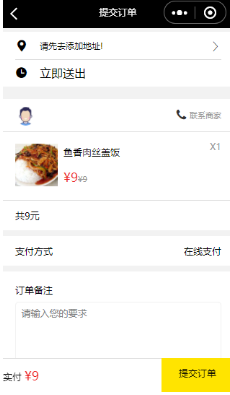 4.订单提交:用户点餐完毕并填写个人信息、收货地址等内容,按照结算结果付款后,就可以安心等待菜品送达,享受美味了。并且在确认收到外卖后还可以对商家服务及菜品进行评价,供其他用户参考。