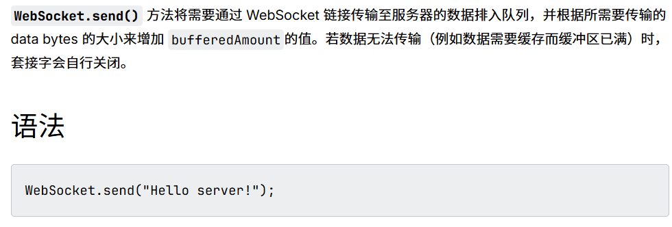 data:要发送的消息内容,只能是字符串、Blob(二进制文件,比如图片)、ArrayBuffer(二进制数据) ;- 最常用:字符串(比如聊天文本),如果要发复杂数据(比如包含用户名、消息内容、时间),需要转成 JSON 字符串(后端再转回去);