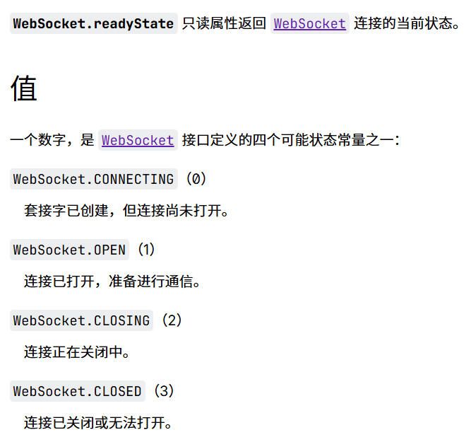 ws 实例的一个属性,用来「实时查看当前连接的状态」,就像你看手机屏幕,知道电话是 "正在拨号""通话中" 还是 "已挂断"。